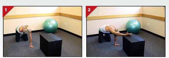 Kneel with the knees directly under the hips. Kneel a little more than arms length away from your stability ball or chair. Reach your arm across your body as the torso flexes over to the side. Keep your thumb pointing up and tuck your pelvis under. You should feel a stretch along the side of your torso. Hold for the desired time and switch sides. (45 second hold)