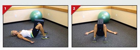 Lie on back with knees bent, feet flat and shoulder-width apart. Draw-in belly button and squeeze butt muscles. Lift pelvis off floor until knees, hips and shoulders are in line, pushing through heels. Lower pelvis to floor.