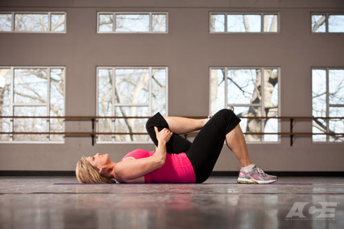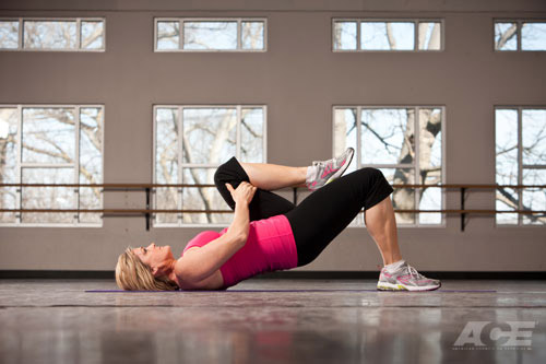 Lie on your back with the knees bent and in line with the hips. Feet flat on the floor and pointing straight ahead. Place a 6” pillow or as yoga block between the knees. Using the inner thighs, squeeze and release using both knees evenly. Only use about 70% of your maximum effort. (3 sets of 20 repetitions)
