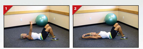 Lie on your back with your knees bent and feet flat on the floor. The knees are in line with the hips. Reach your arms straight out above you, keeping the elbows straight. Clasp your hands together. Keeping both arms straight lower arms up and over your head toward the floor. Only go as far as you can while keeping the elbows straight. Raise back up so the arms are perpendicular to the